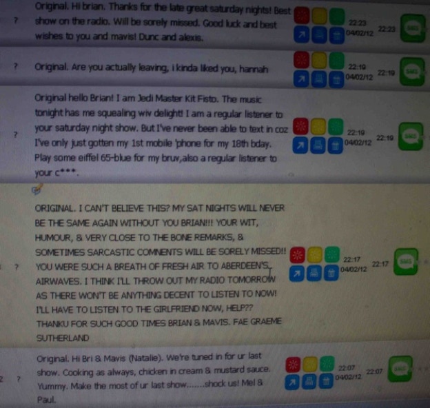Texts and Emails……. Some from the early days when I presented the weekday and weekend late shows for 50 pounds a programme and filled in on a few daytime programmes. Renumeration dropped to Zero when the station was sold…… and some from my last programme……….