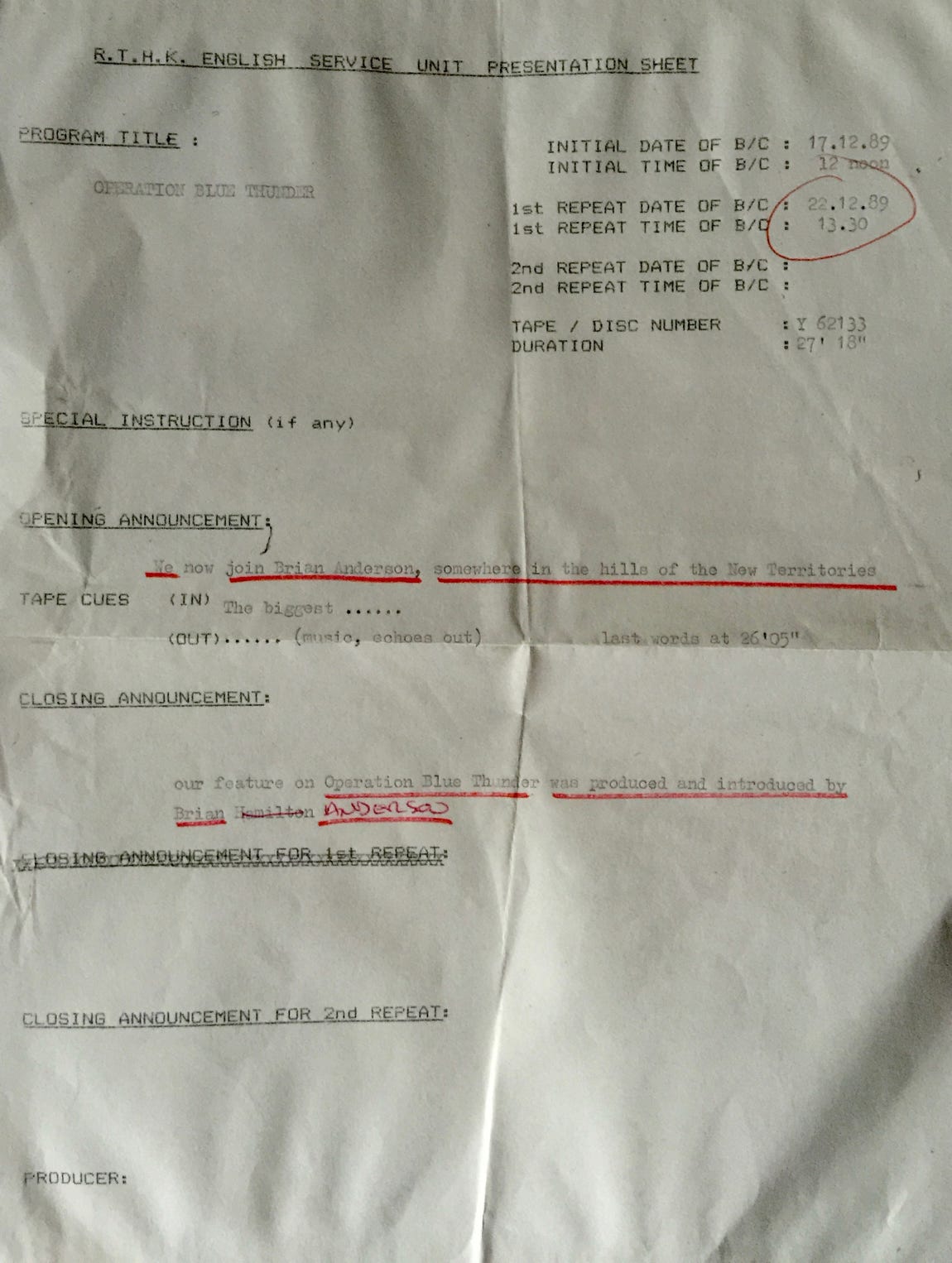 I spent a month with RTHK Radio 3 in October 1989 presenting through the night programmes, Producing Station promos and recording a few random documentaries